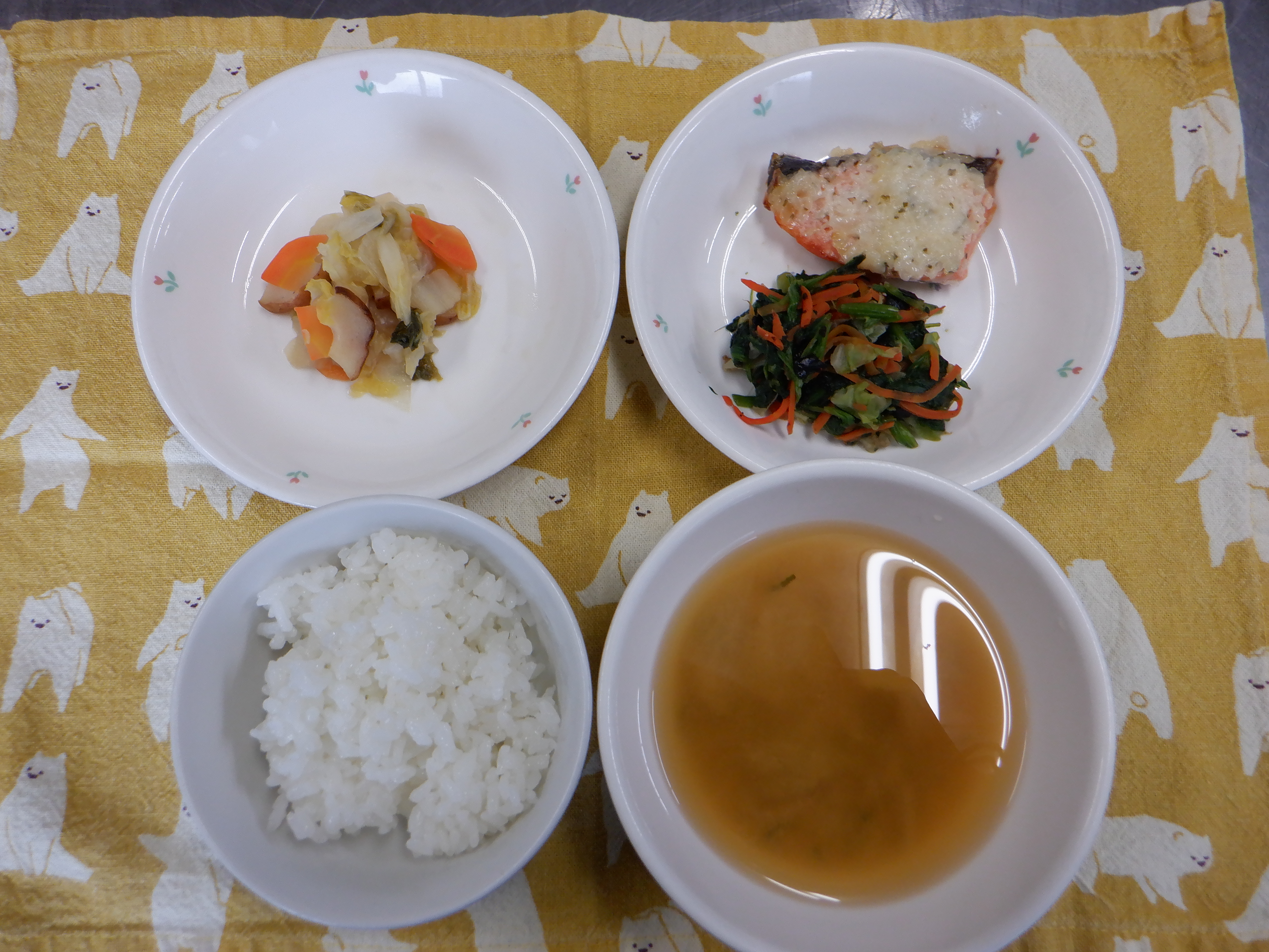 ごはん・鮭のタルタル焼き・ほうれん草のお浸し