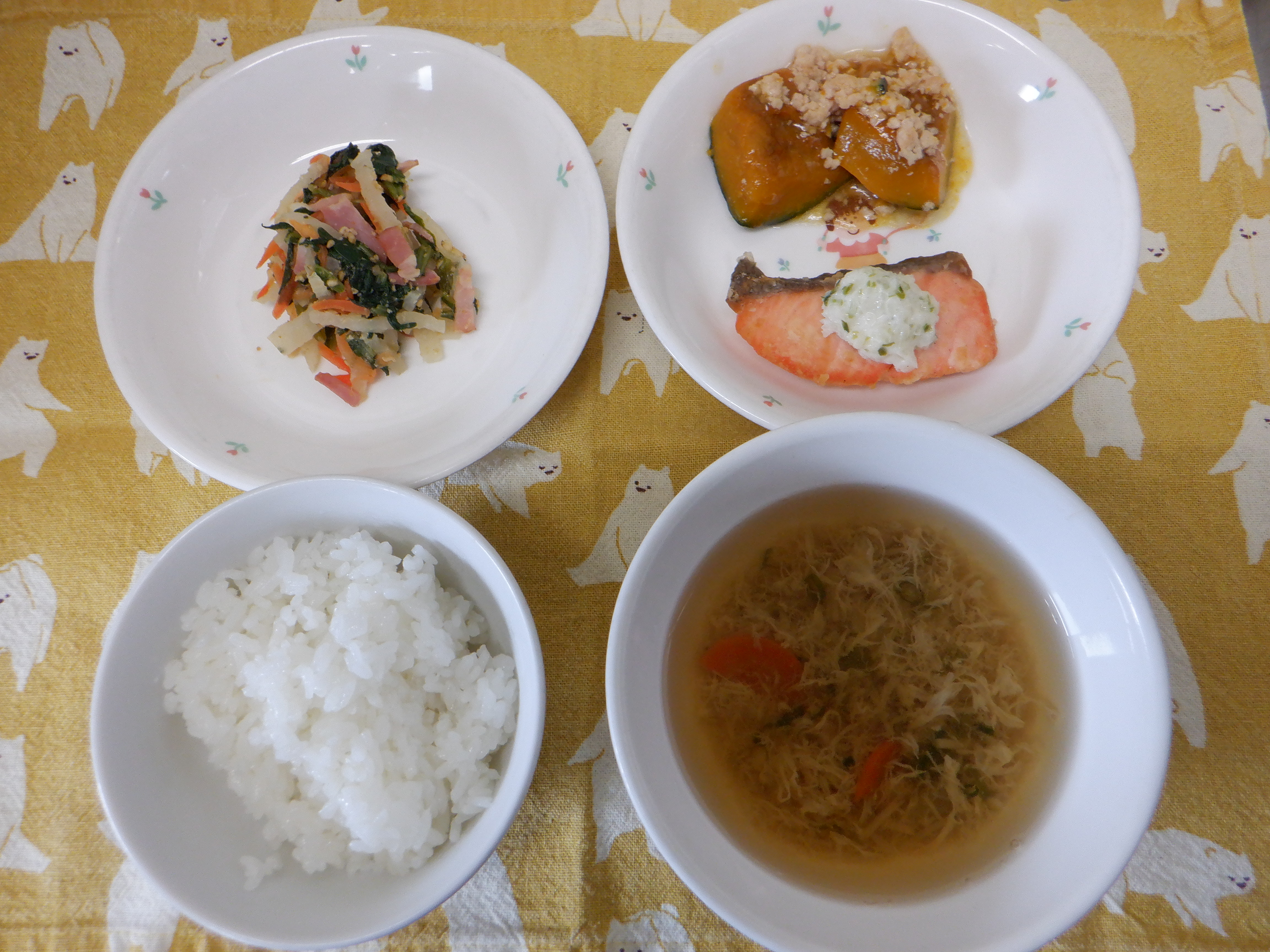 かぼちゃのそぼろあんかけ・卵ときのこのすまし汁
