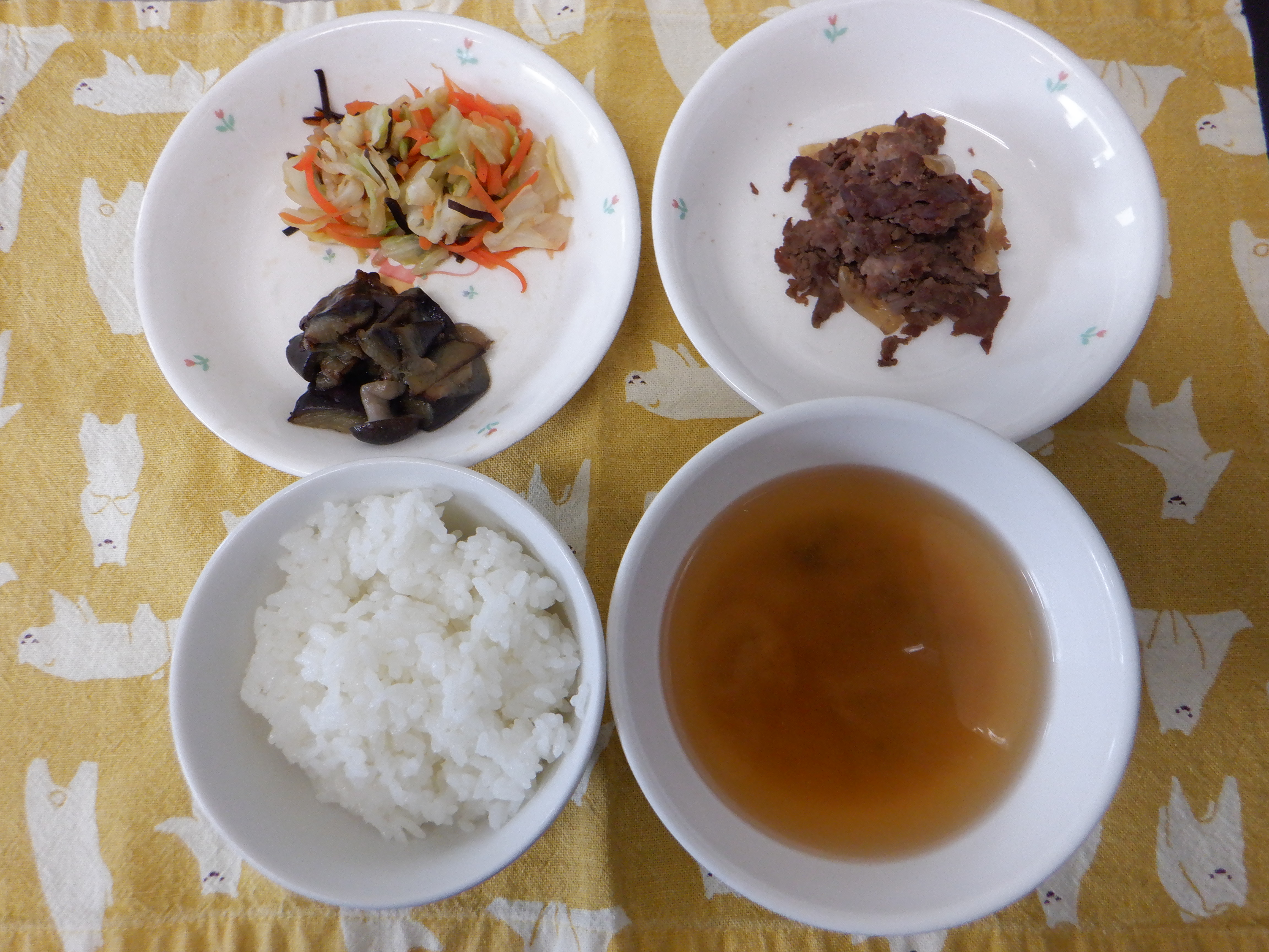 ご飯・牛肉の炒め物・キャベツの塩昆布和え