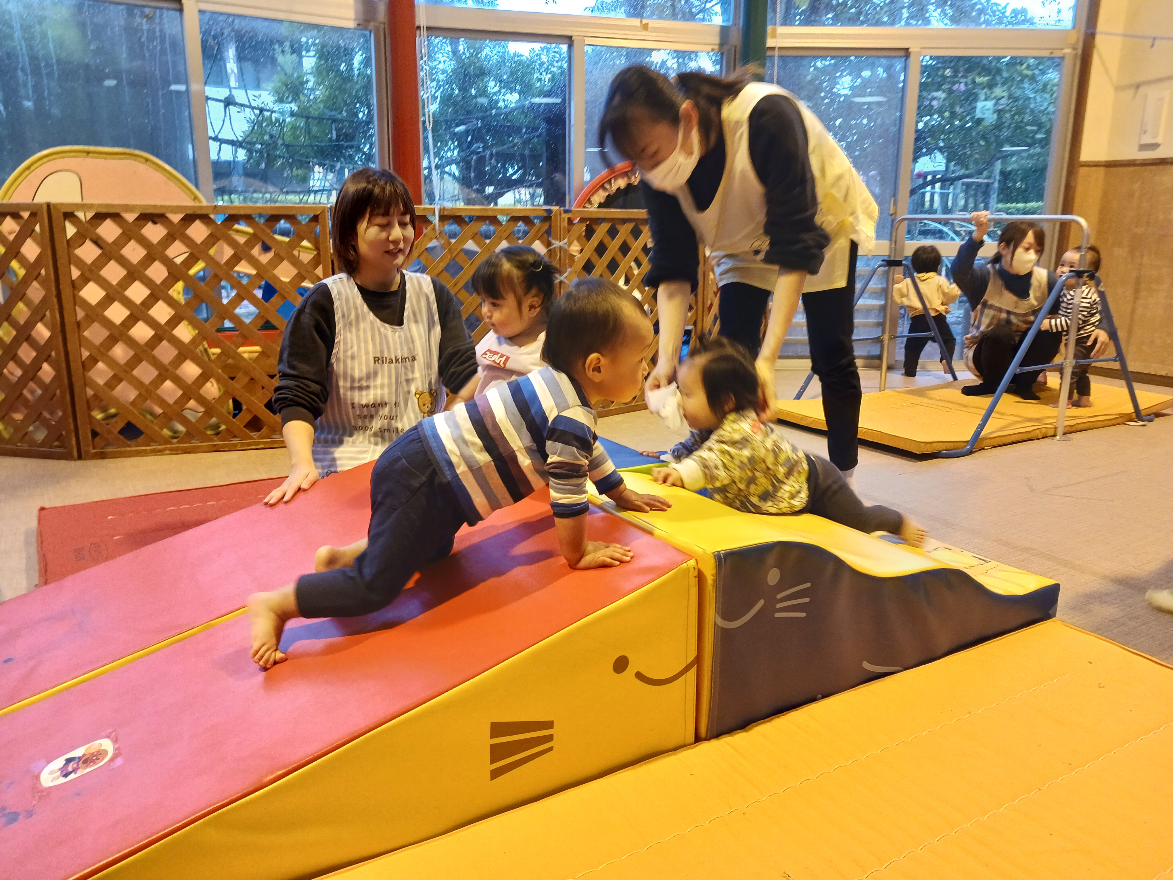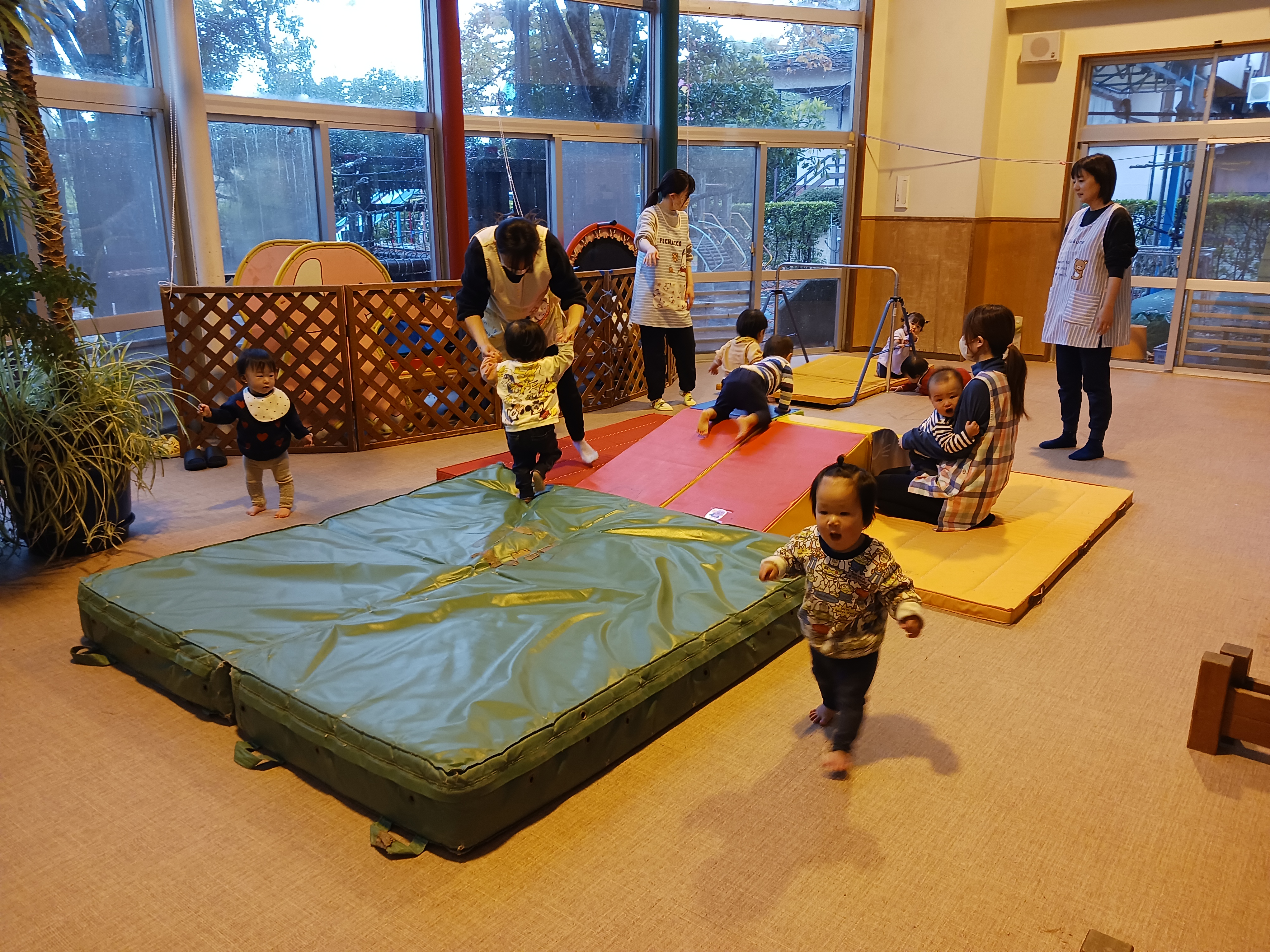 柔らか素材の階段・すべり台は部屋でもあそんでいますが、ホールだとジャンボマットもつなぐことが出来、思いっきり体を動かしてあそぶことができます。
