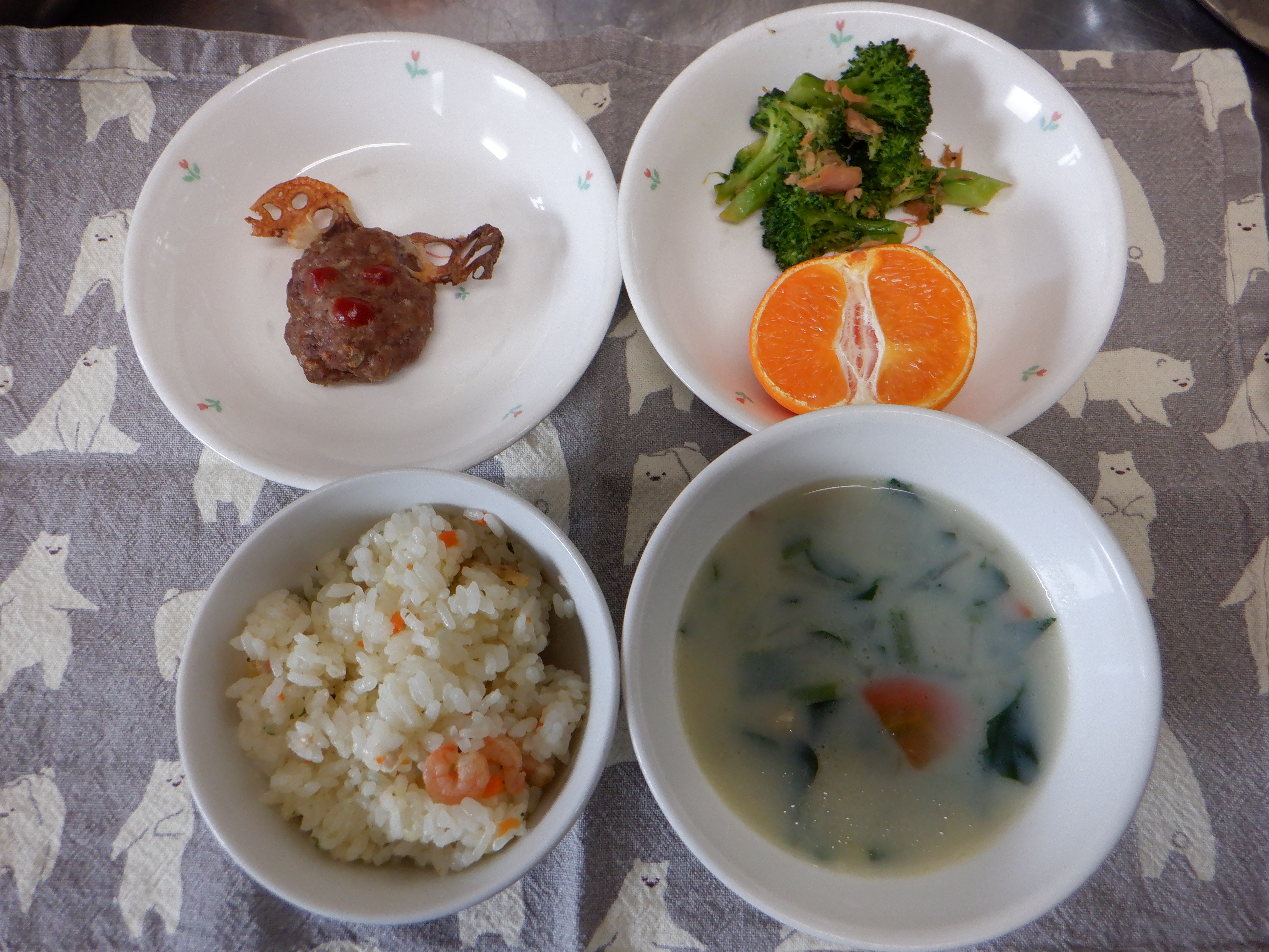 えびとあさりのピラフ・トナカイハンバーグ・ブロッコリーとツナのサラダ