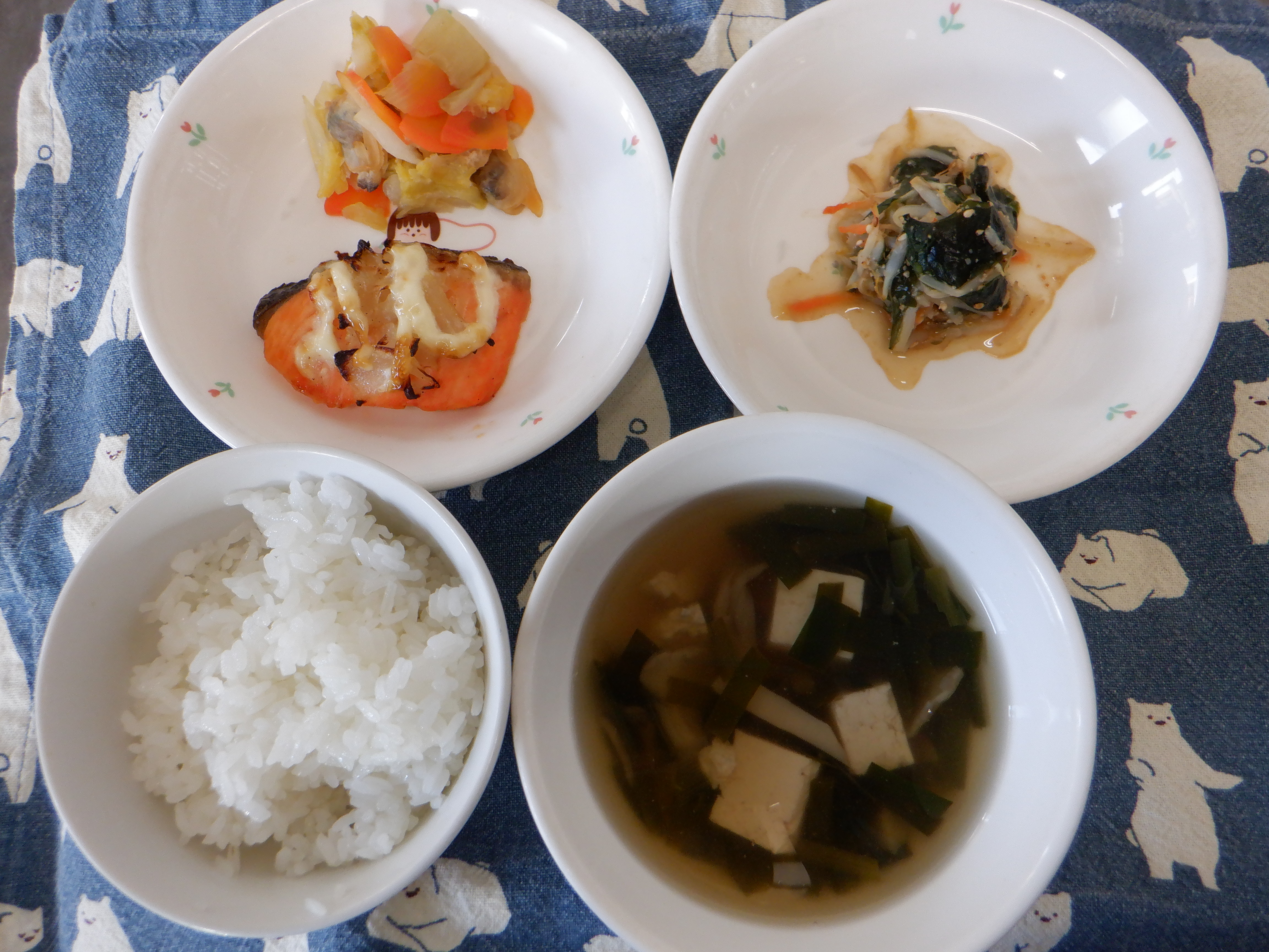 ごはん・鮭のマヨネーズ焼き・もやしとわかめのナムル