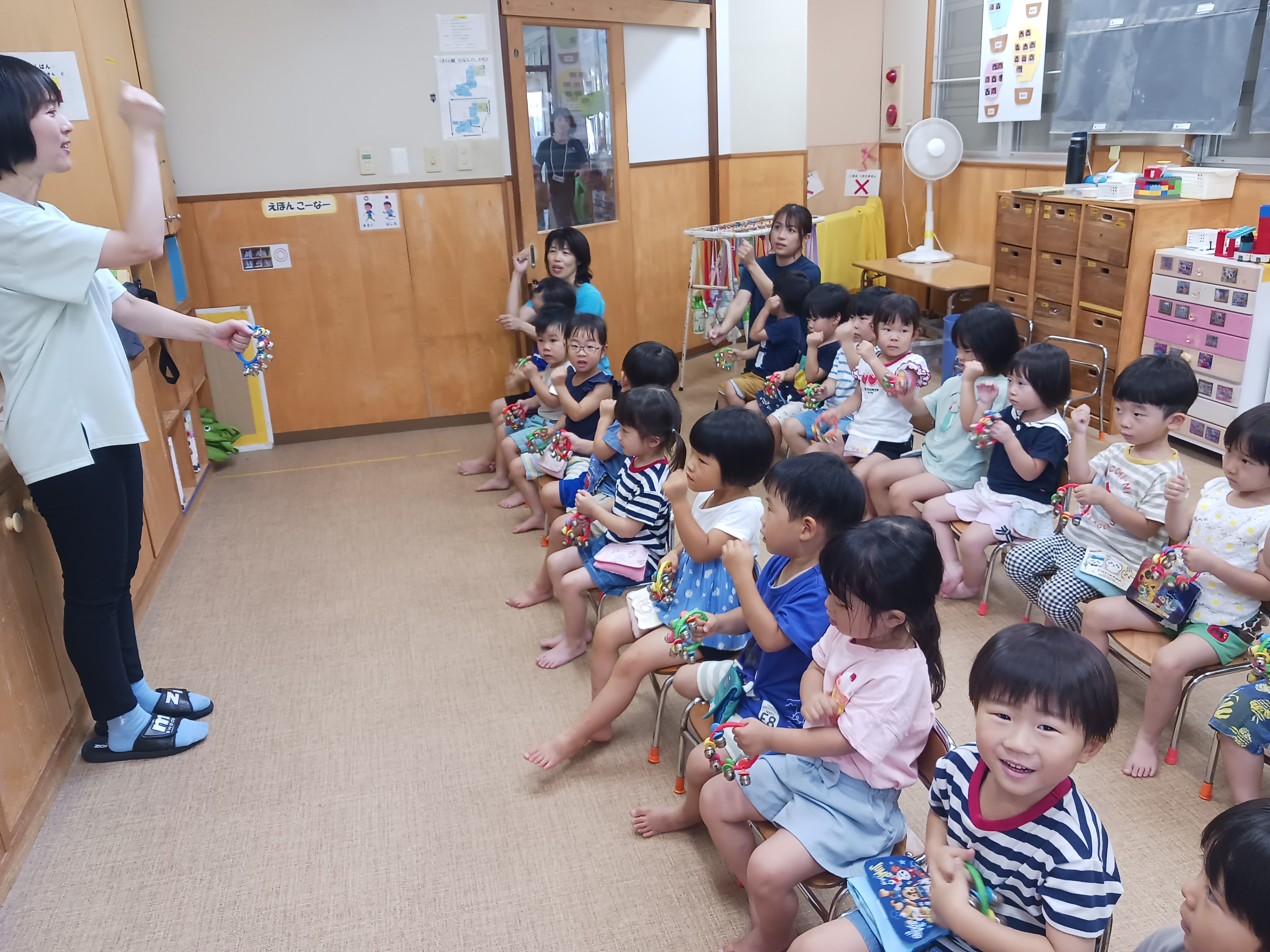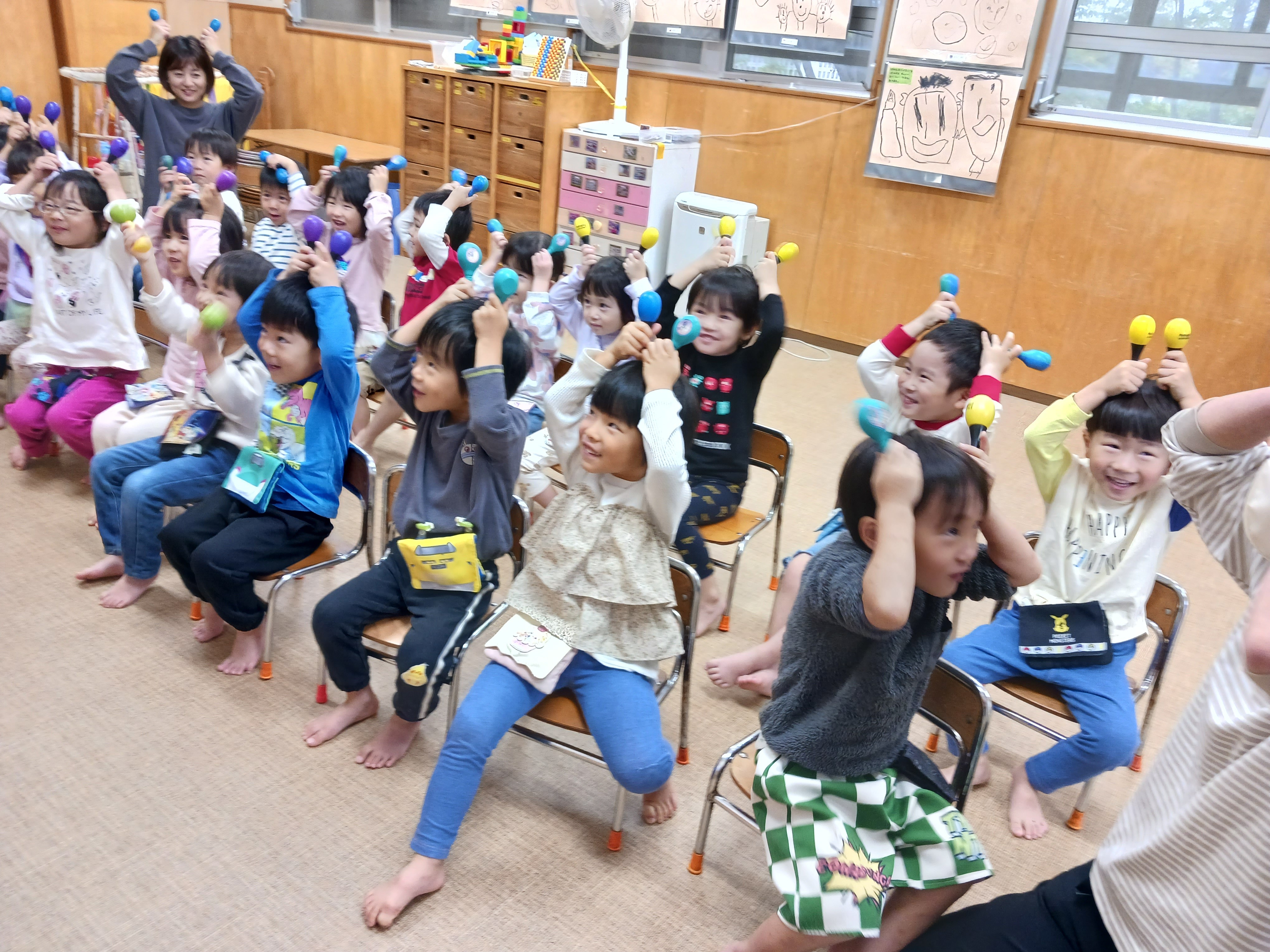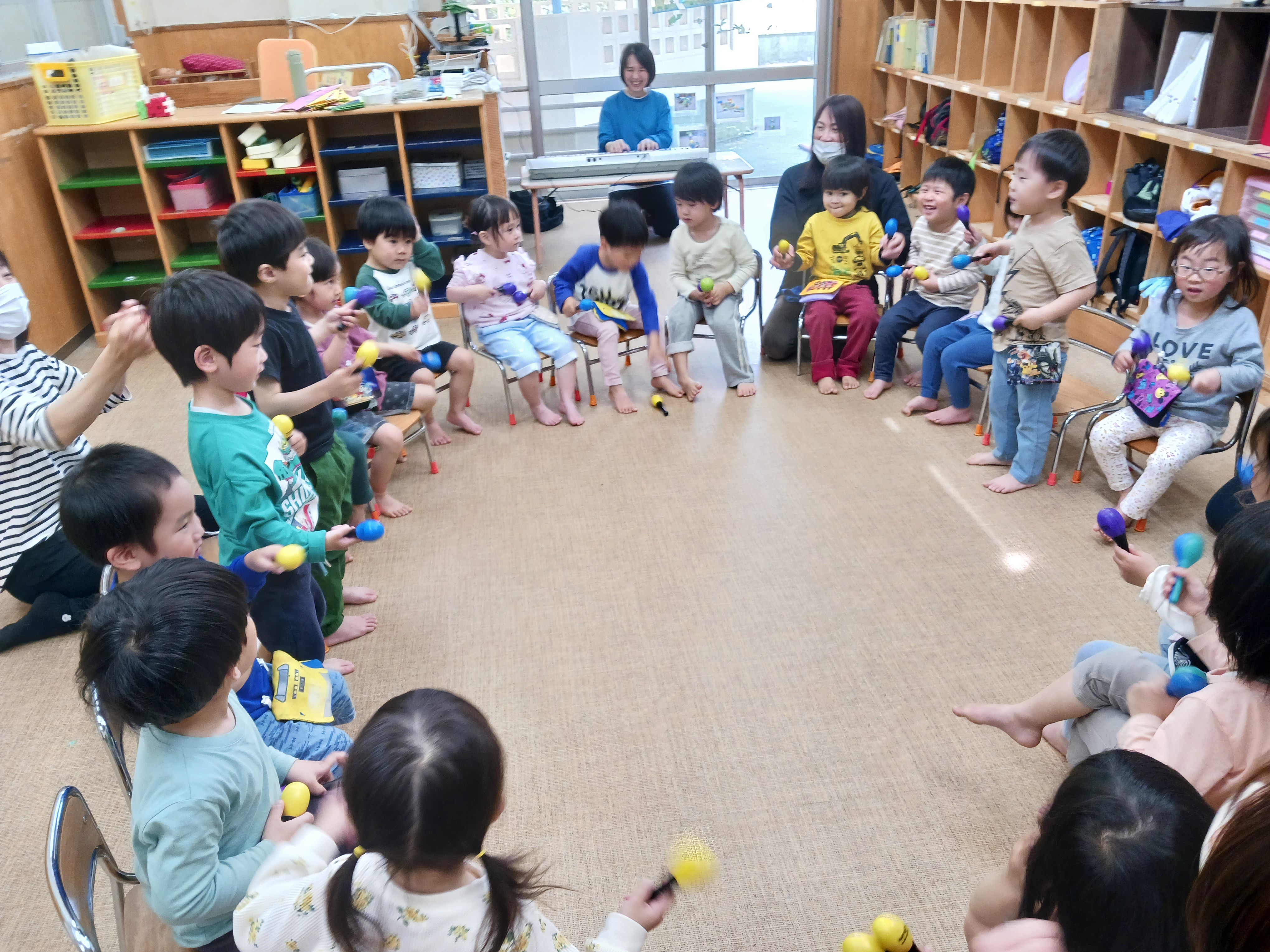 倉吉東こども園では、各年齢クラスごとに、月1回の音あそびを実施しています。