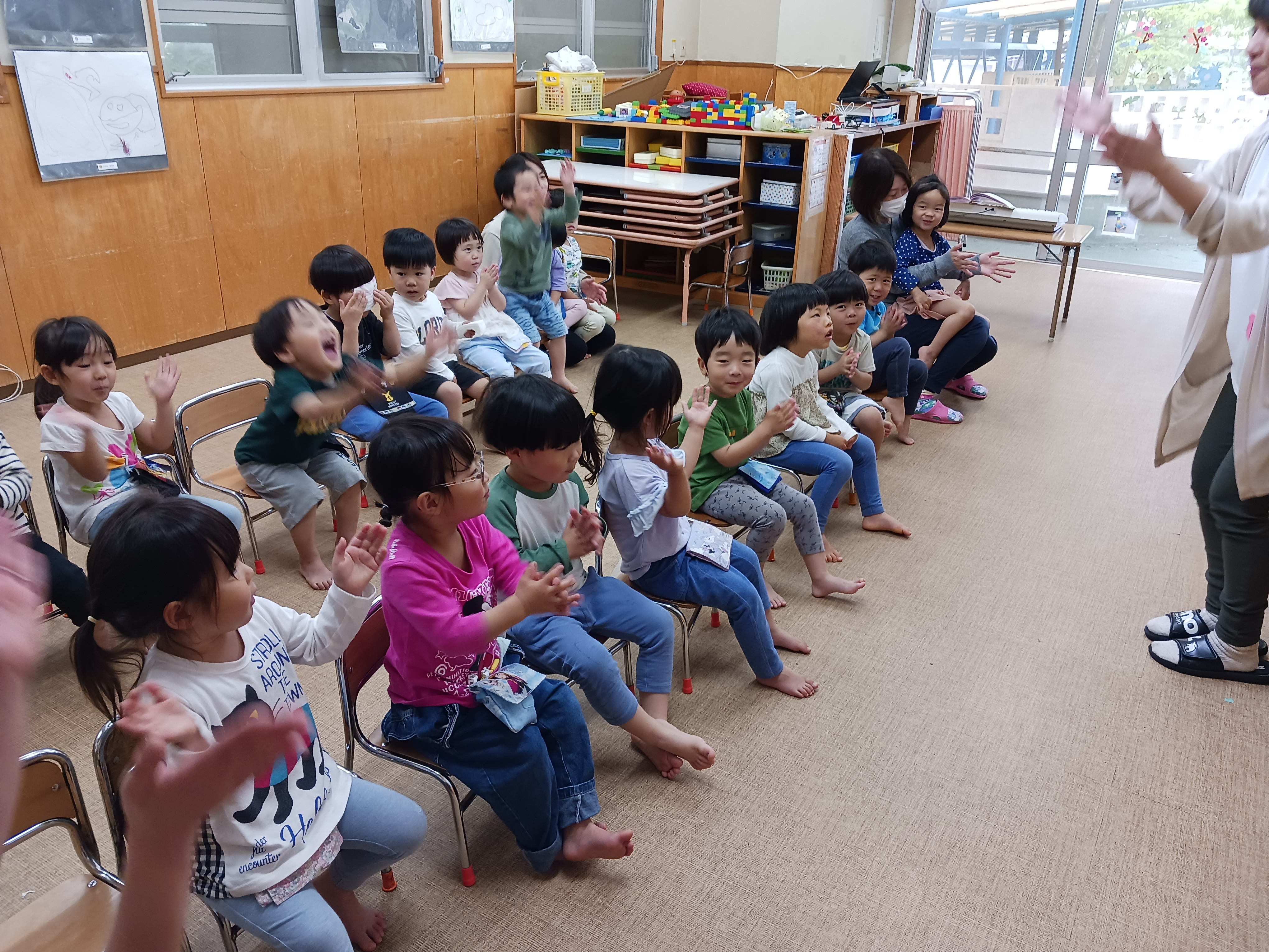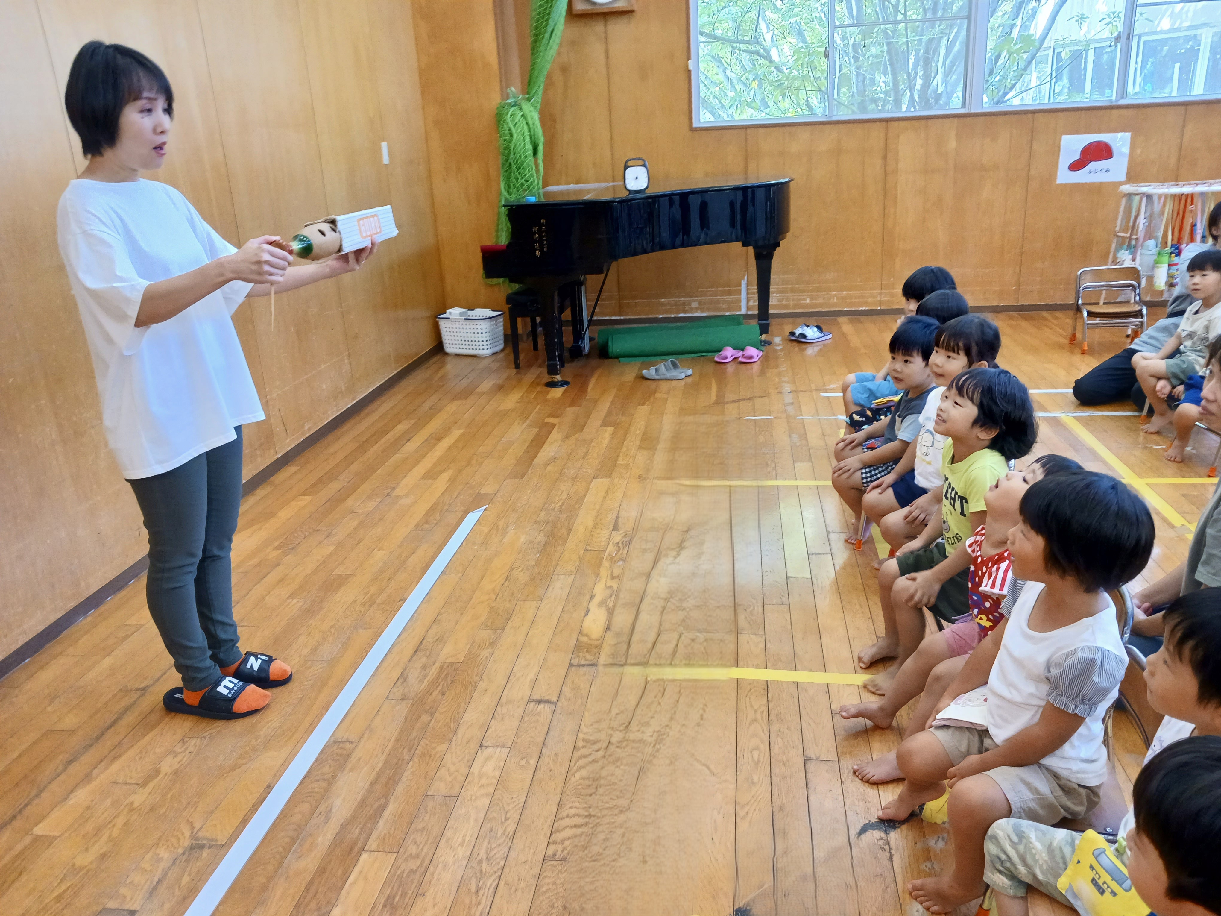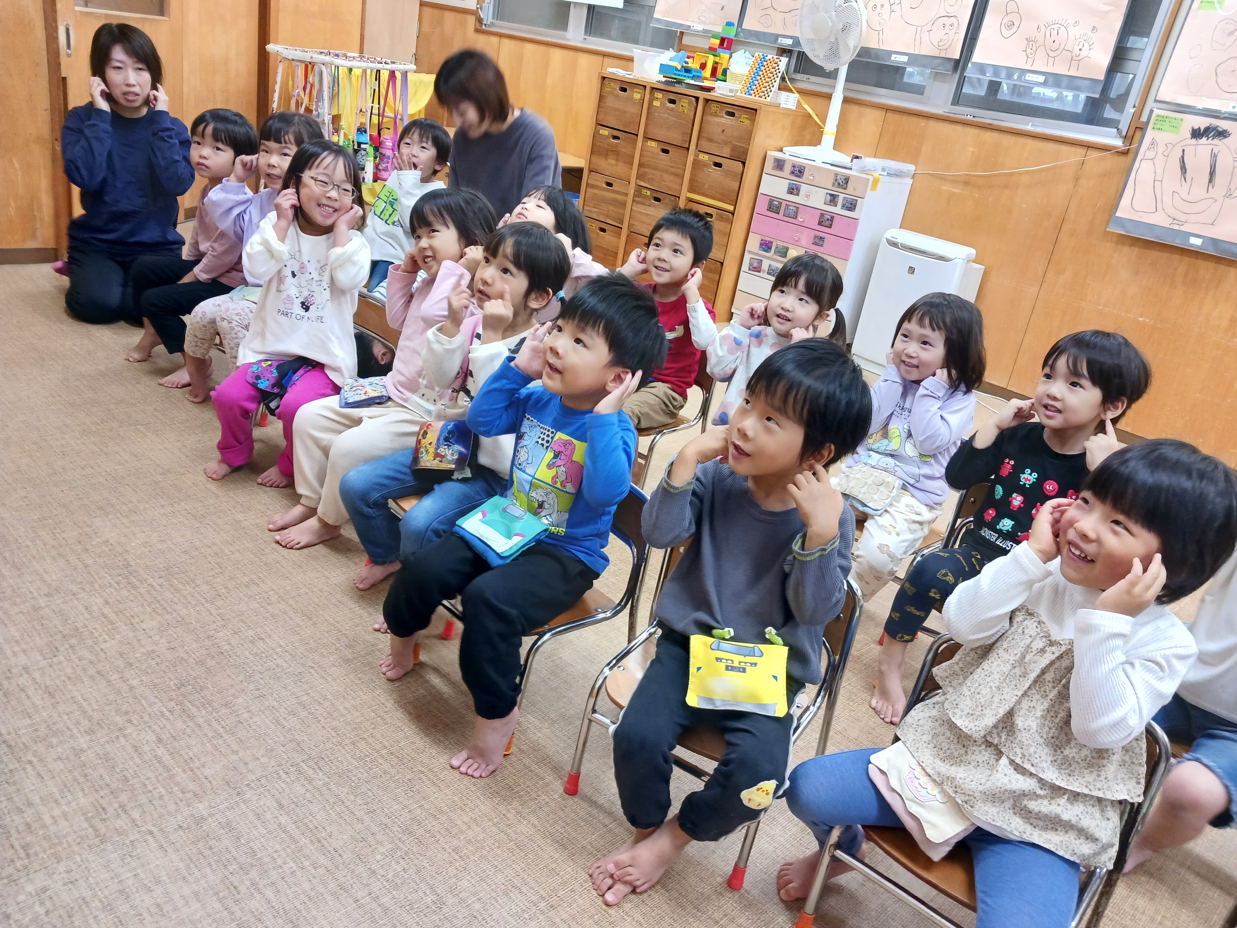 倉吉東こども園では、各年齢クラスごとに、月1回の音あそびを実施しています。