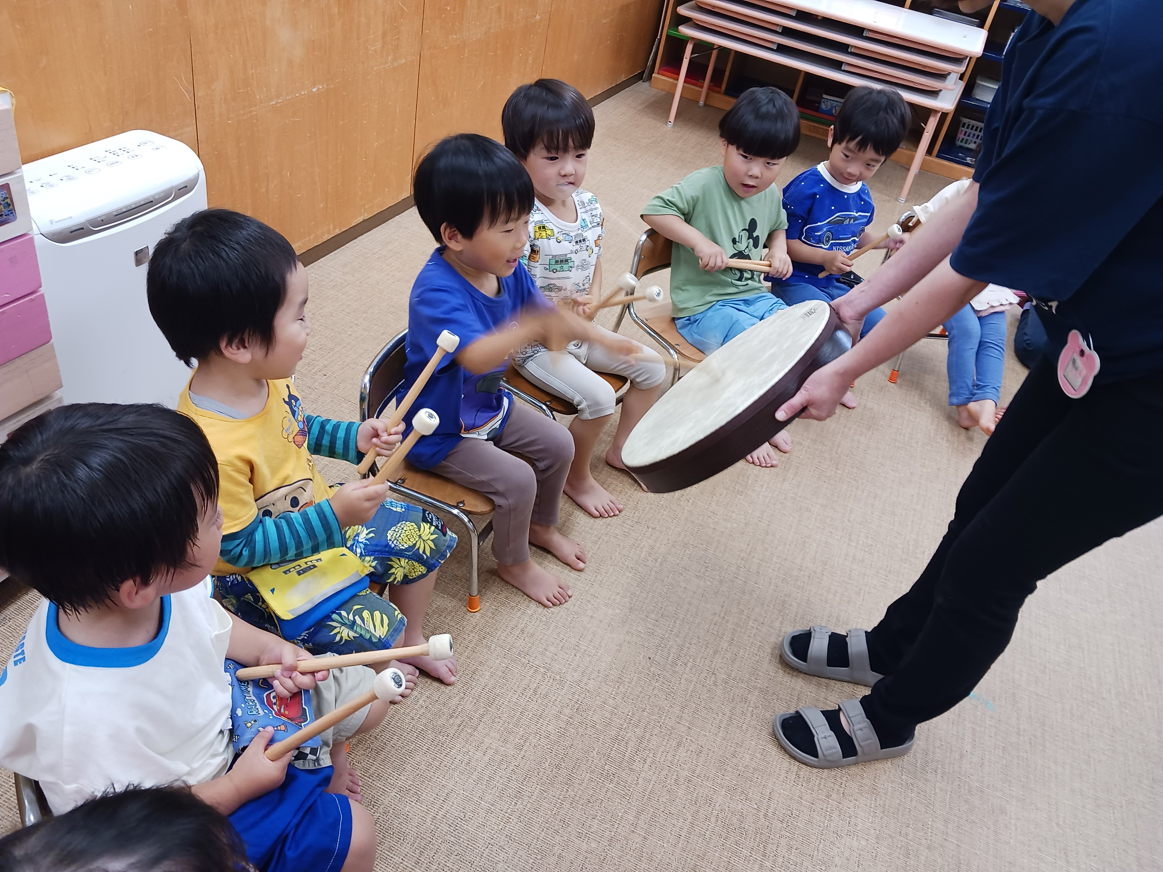 初夏:『タイコをたたこう』では、初めは自由に、次は大きな音でたくさん、最後は小さな音で叩いてみました。音の強弱を意識しながら叩いたり、友だちの音を聞いて「いっぱいだった!」「優しい~」等の声も聞かれました。