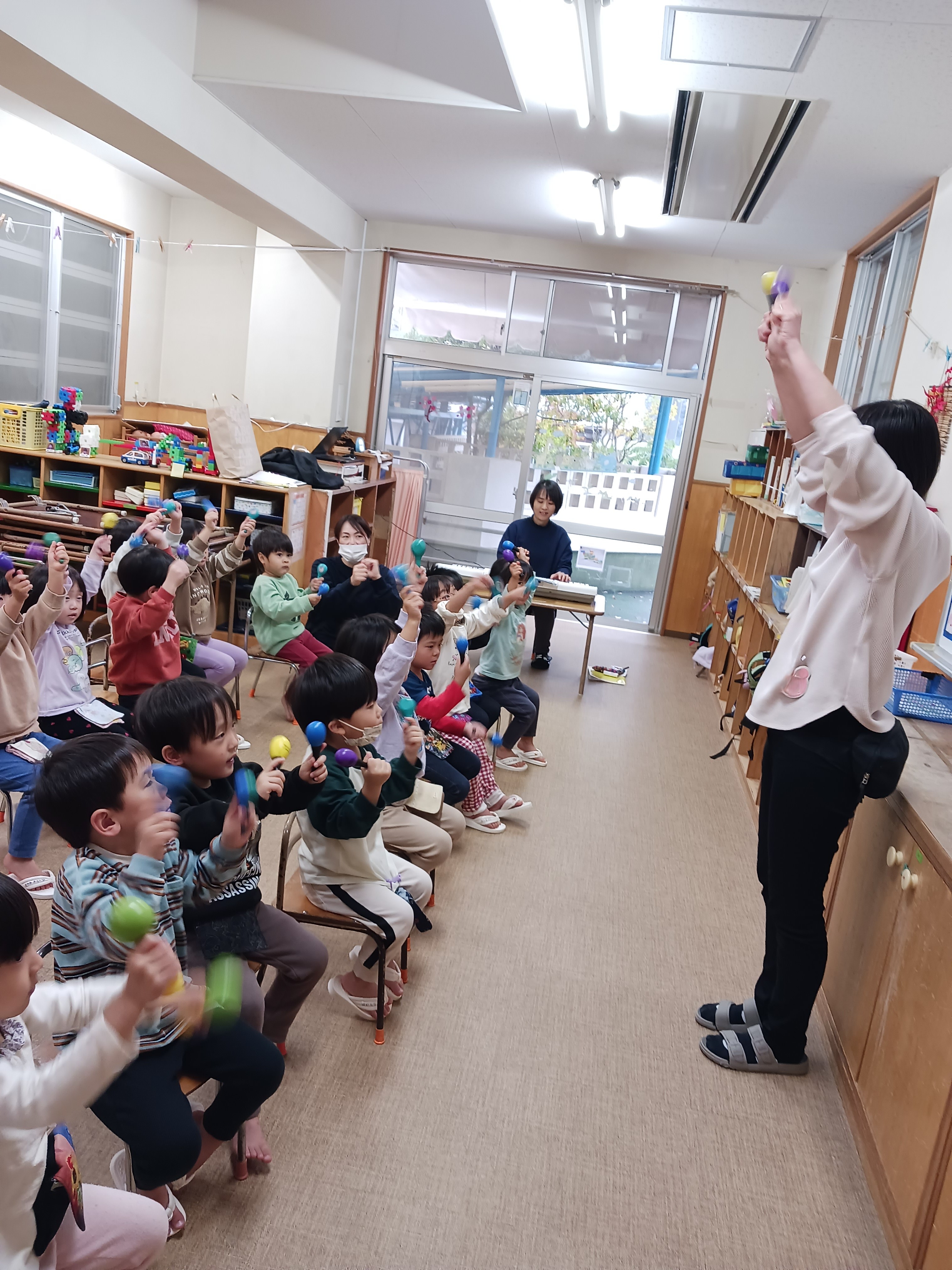 秋(ハロウィン):『おばけなんてないさ♪』を歌いました。歌指導を受け、歌詞を丁寧に元気に歌っていた子どもたちです。その後、その後、マラキタスを使い『マラカス鳴らそう』の曲で、キーボードの音やリズムに合わせ強弱、急緩の変化を楽しんだり『おにのパンツ』の曲で保育者の振り付けを真似て鳴らし楽しみました。