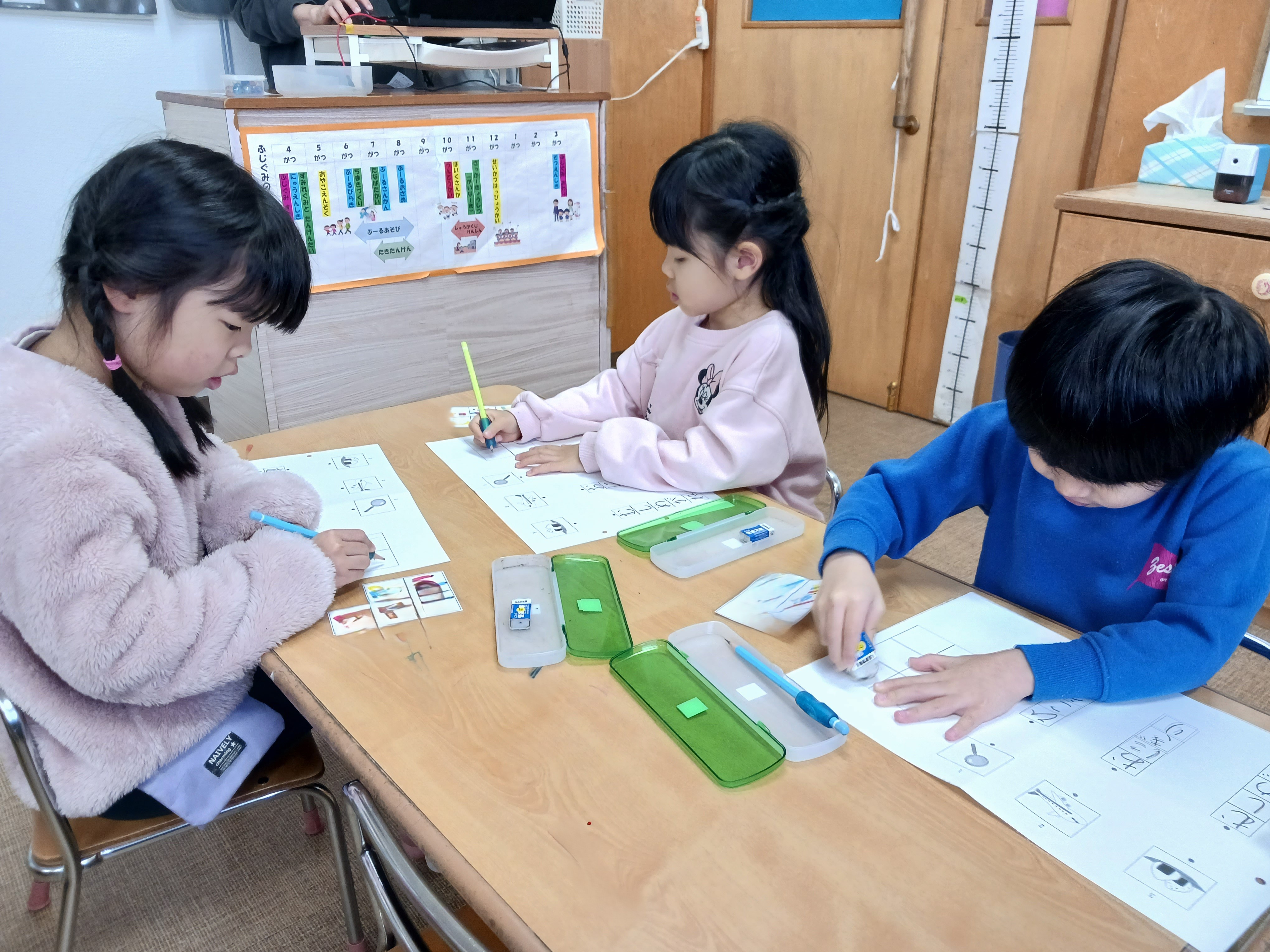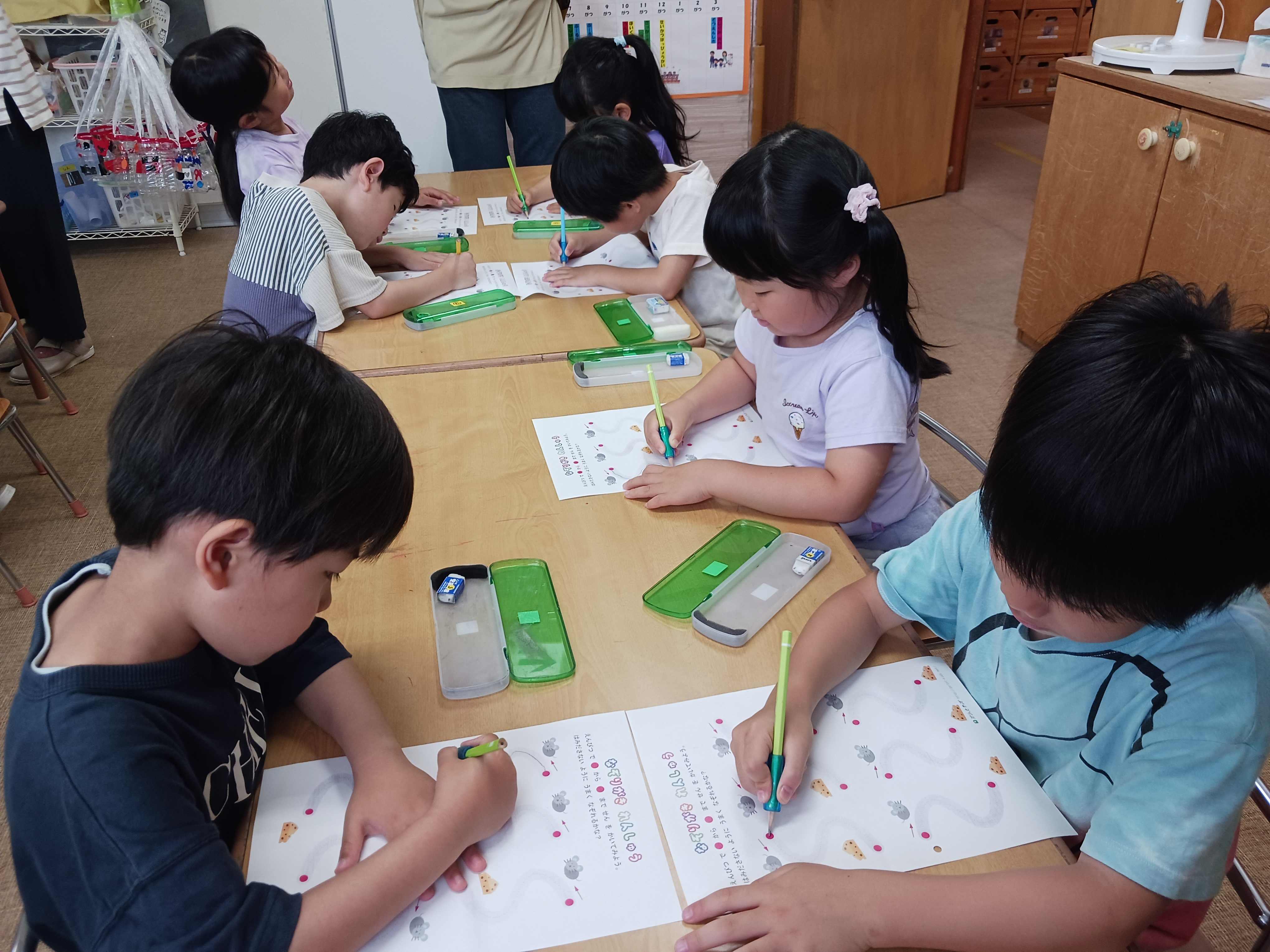 5歳児年長児は、落ち着いて話を聞いたり、じっくり物事に取り組む姿勢を養うことを目的とした『鉛筆あそび』を月に1回行っています。