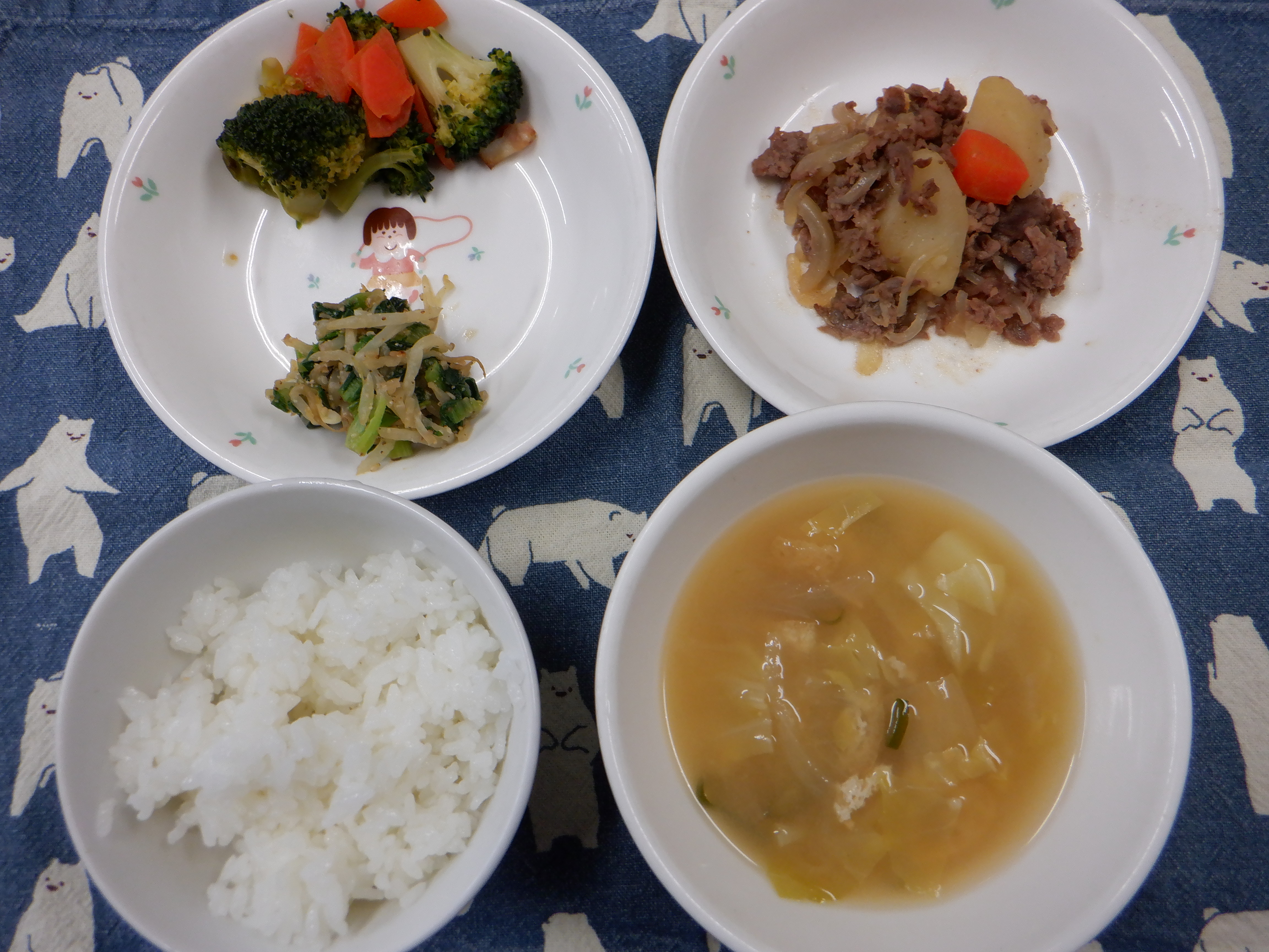 ご飯・肉じゃが・ブロッコリーの炒め物