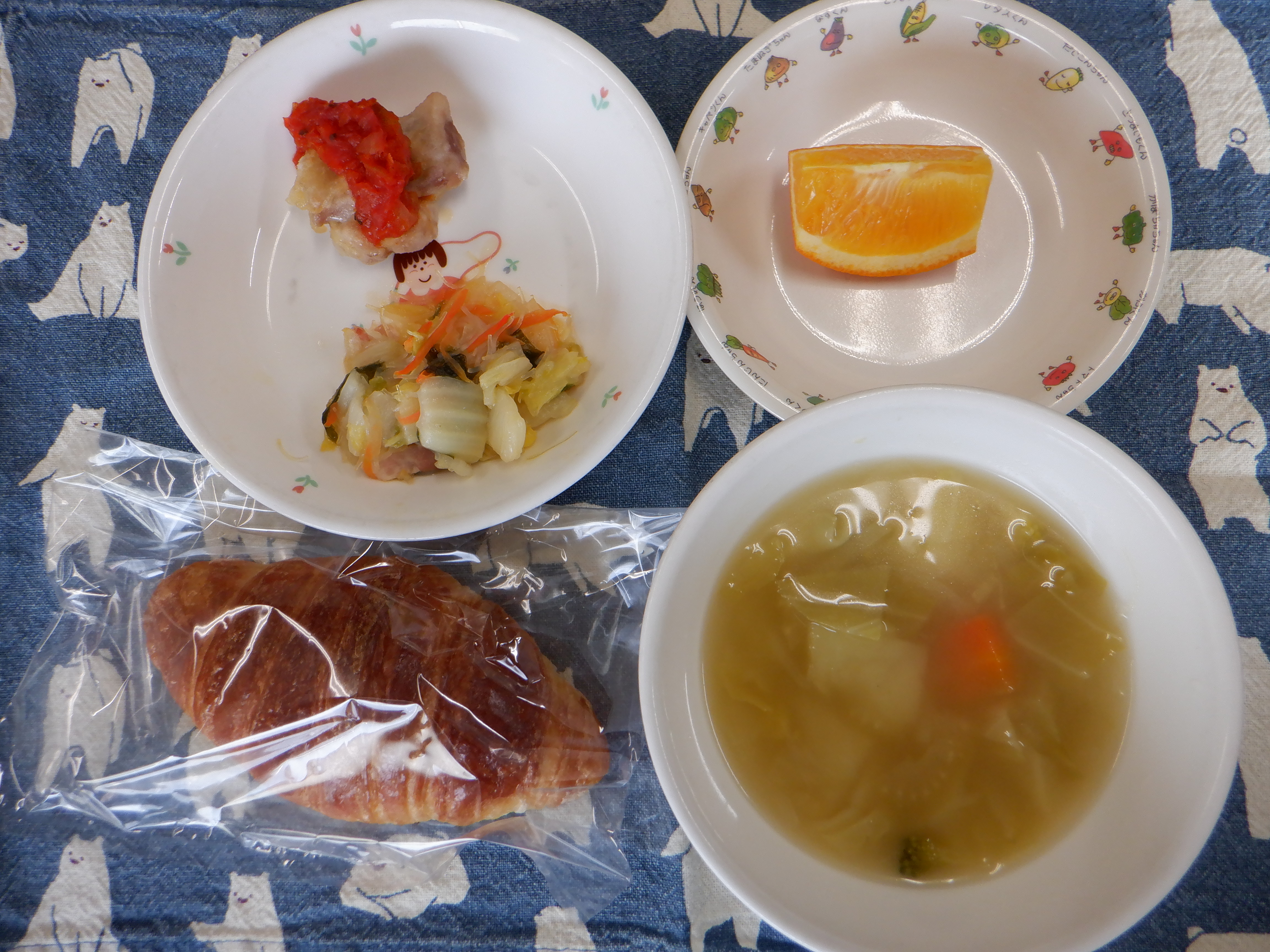 クロワッサン・鶏肉のトマトソースかけ・白菜とベーコンのレモンサラダ